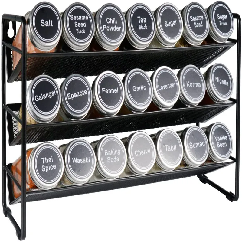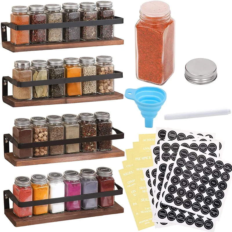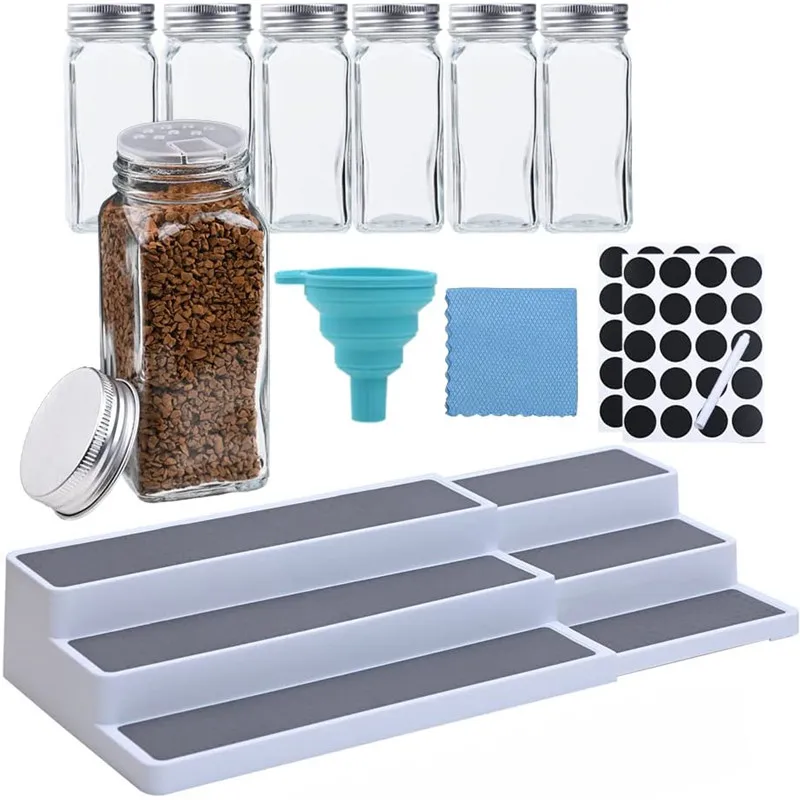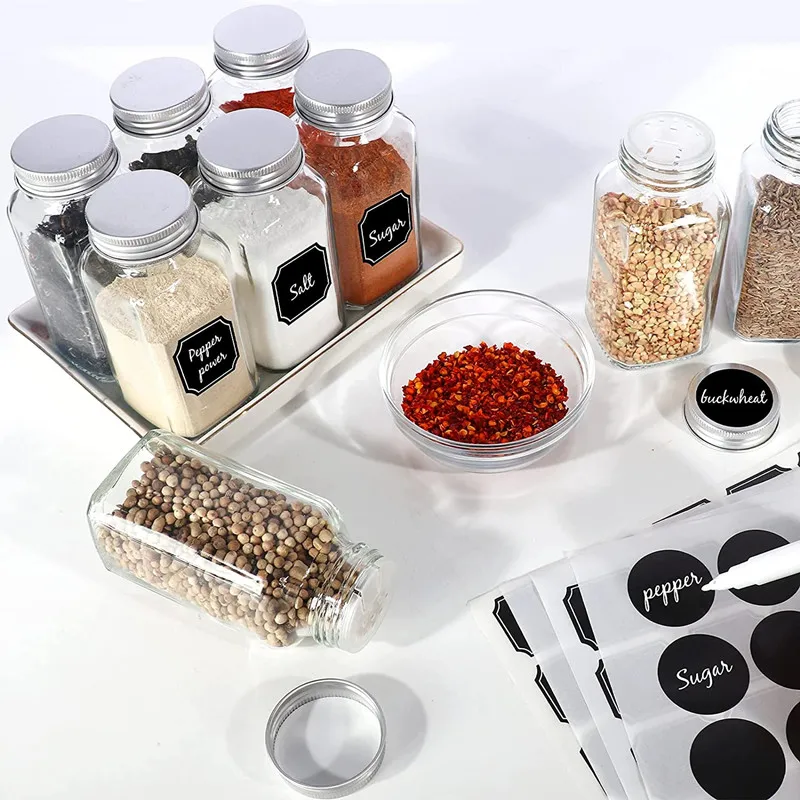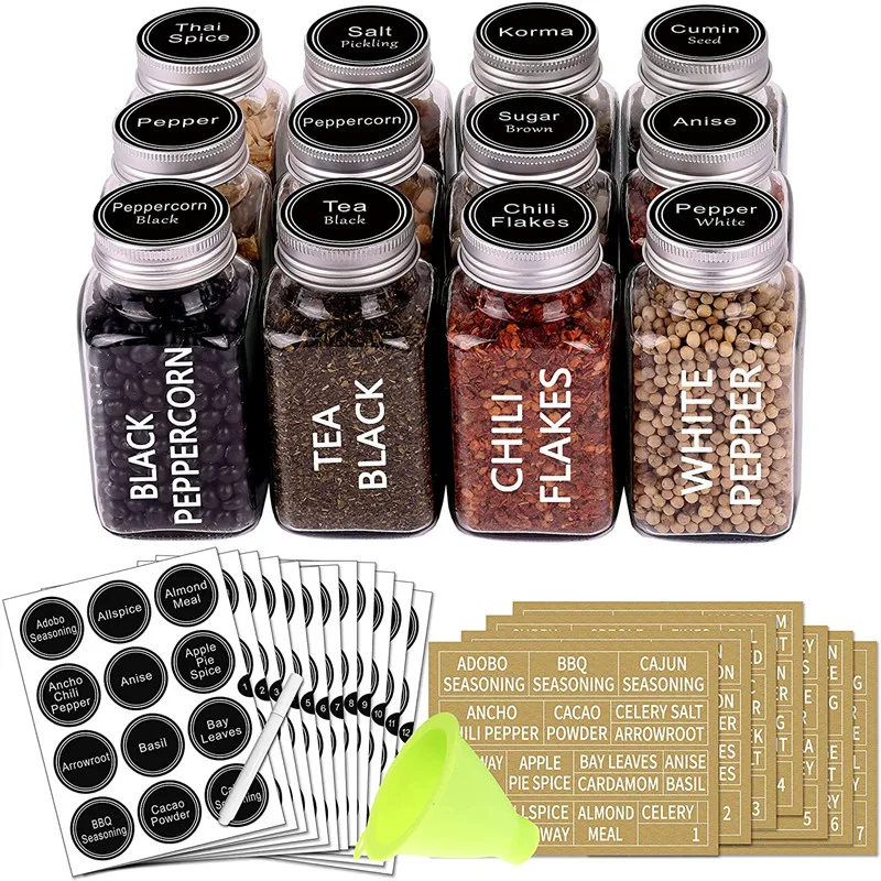- COMPLETE SQUARE SPICE CONTAINER SET: 12 clear glass spice jars are ready to hold your favorite spices! Organize your kitchen cabinets and spice racks with our spice containers and 24 labels.