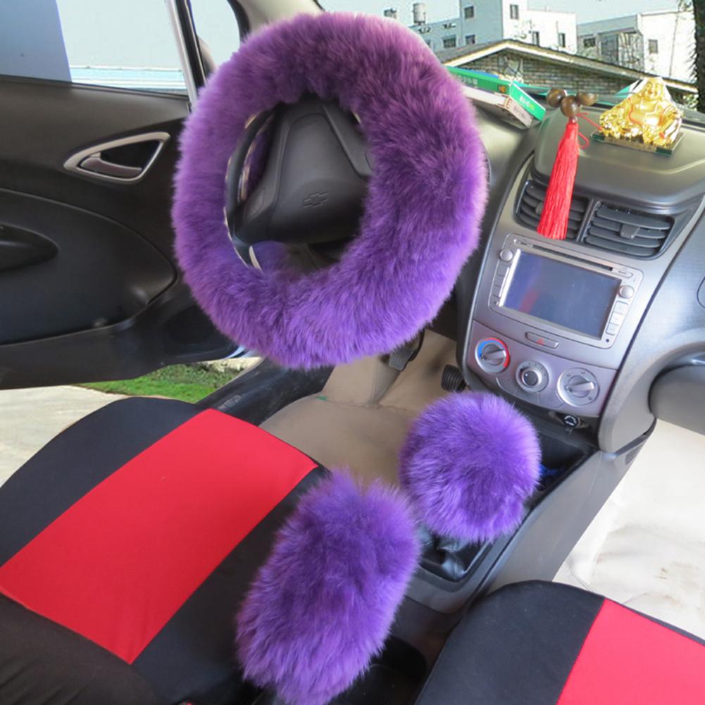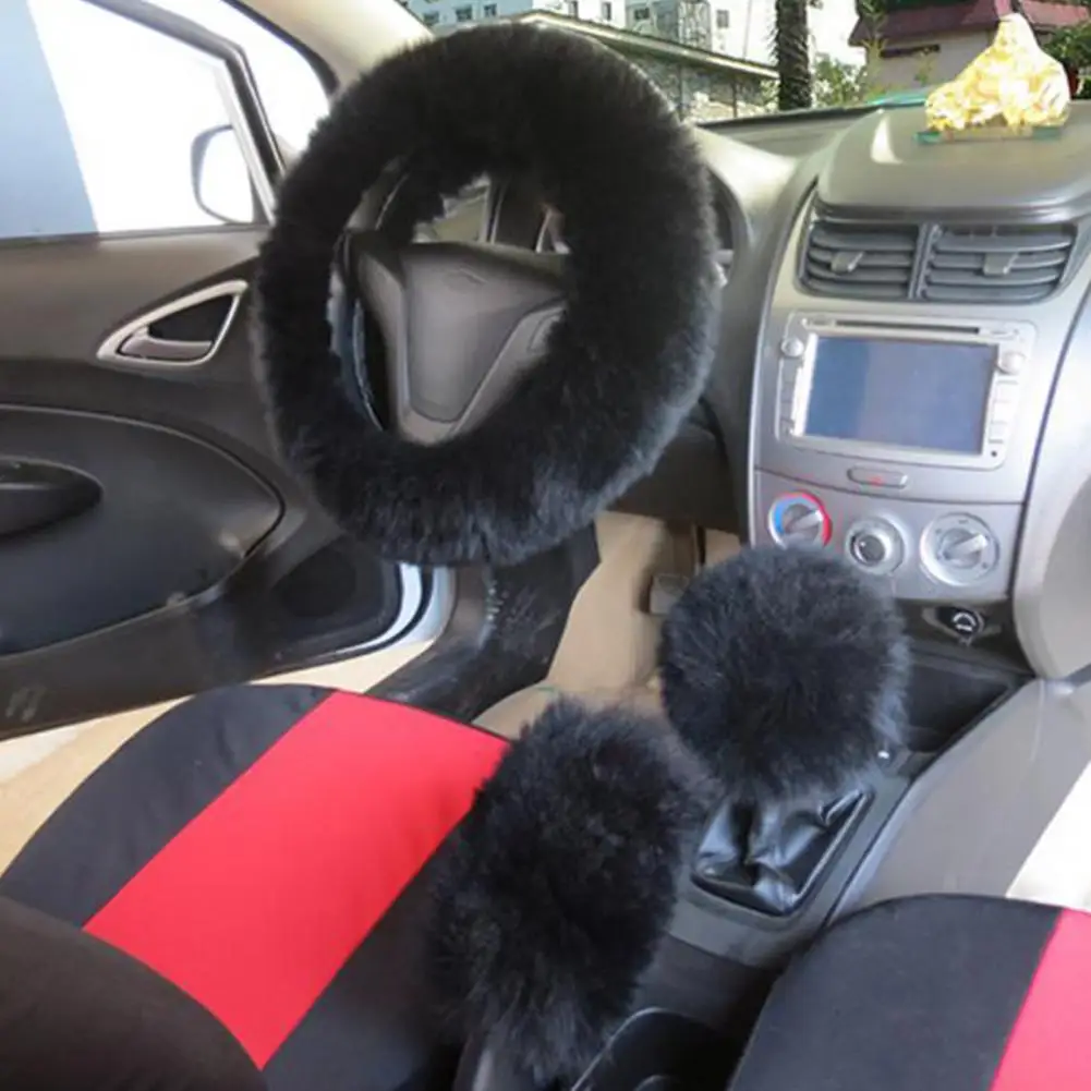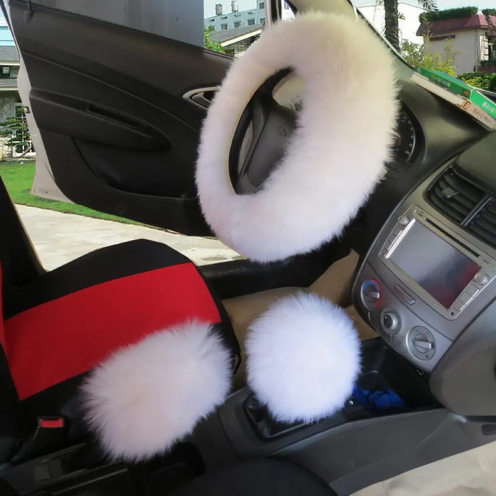 Fuzzy Steering Wheel Cover Woolen Handbrake Car Accessory Fur Plush Protector Cover Kit
