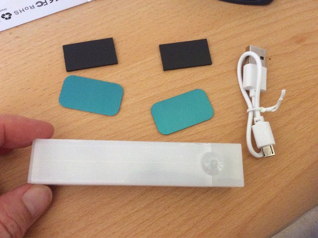 The light is fairly bright and works well. It detects movement even from a long distance. I expected the light come on only in the dark (like my other types of movement sensitive lights) but this one comes on even in a bright day light which I find pointless and wasting energy. There is a switch to three options: on all the time, off, sensing movement. I did not have to charge it yet. It came charged. To attach the light there are glue on magnets.