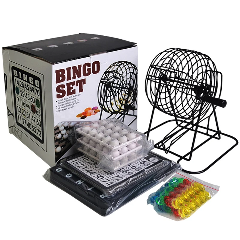 18 bingo cards, iron base, 75 bingo white balls, 150pcs markers, paper master board, 1 instruction