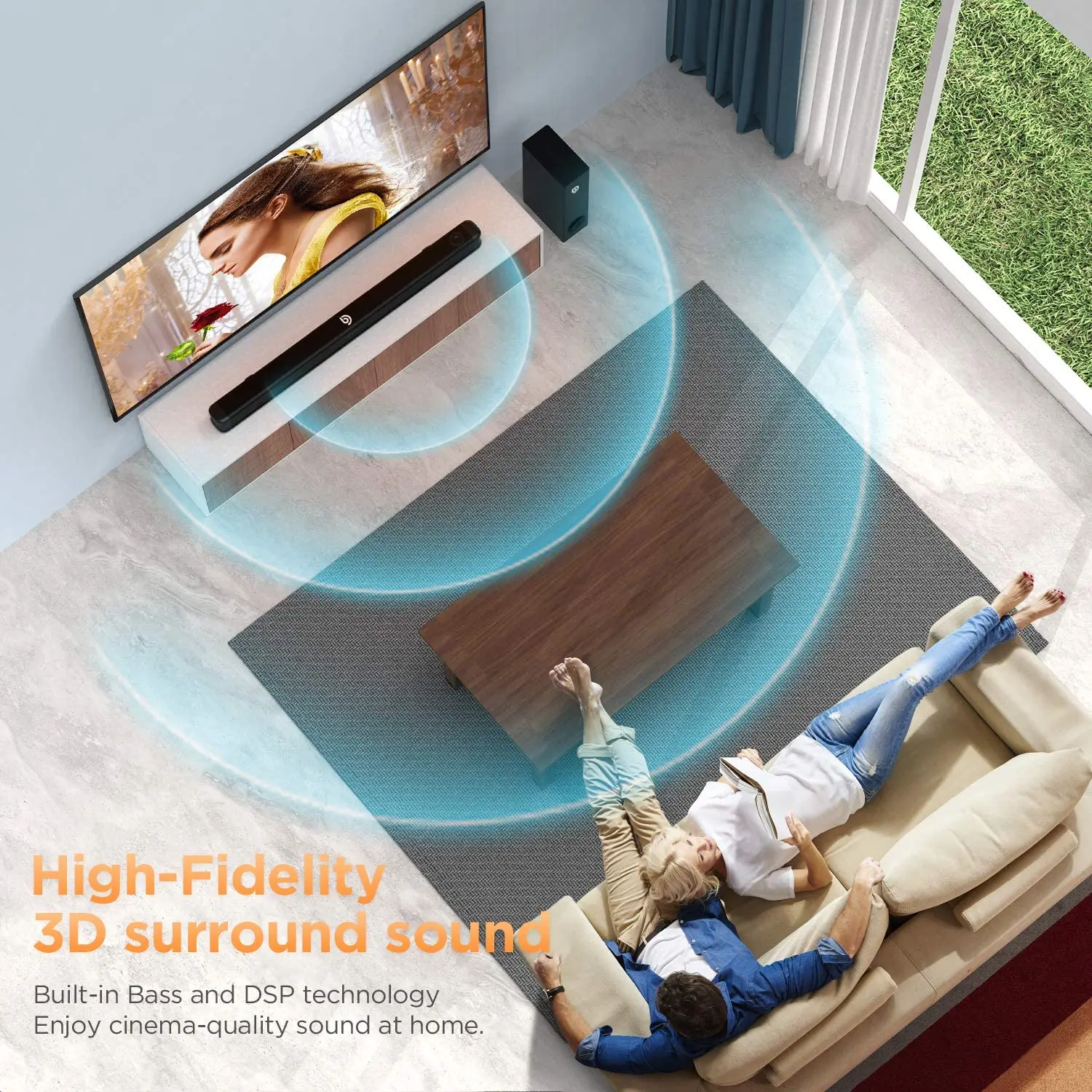 150W Power: The 2.1 channel TV soundbar provides 150W power and the cavity configuration is elongated to allow sound to enter the soundbar better. Distortion below 0.5% gives you HIFI sound quality and you won't hear any hiss at low volume. Humbuckers provide a more accurate soundstage and increase the dynamics of the sound.