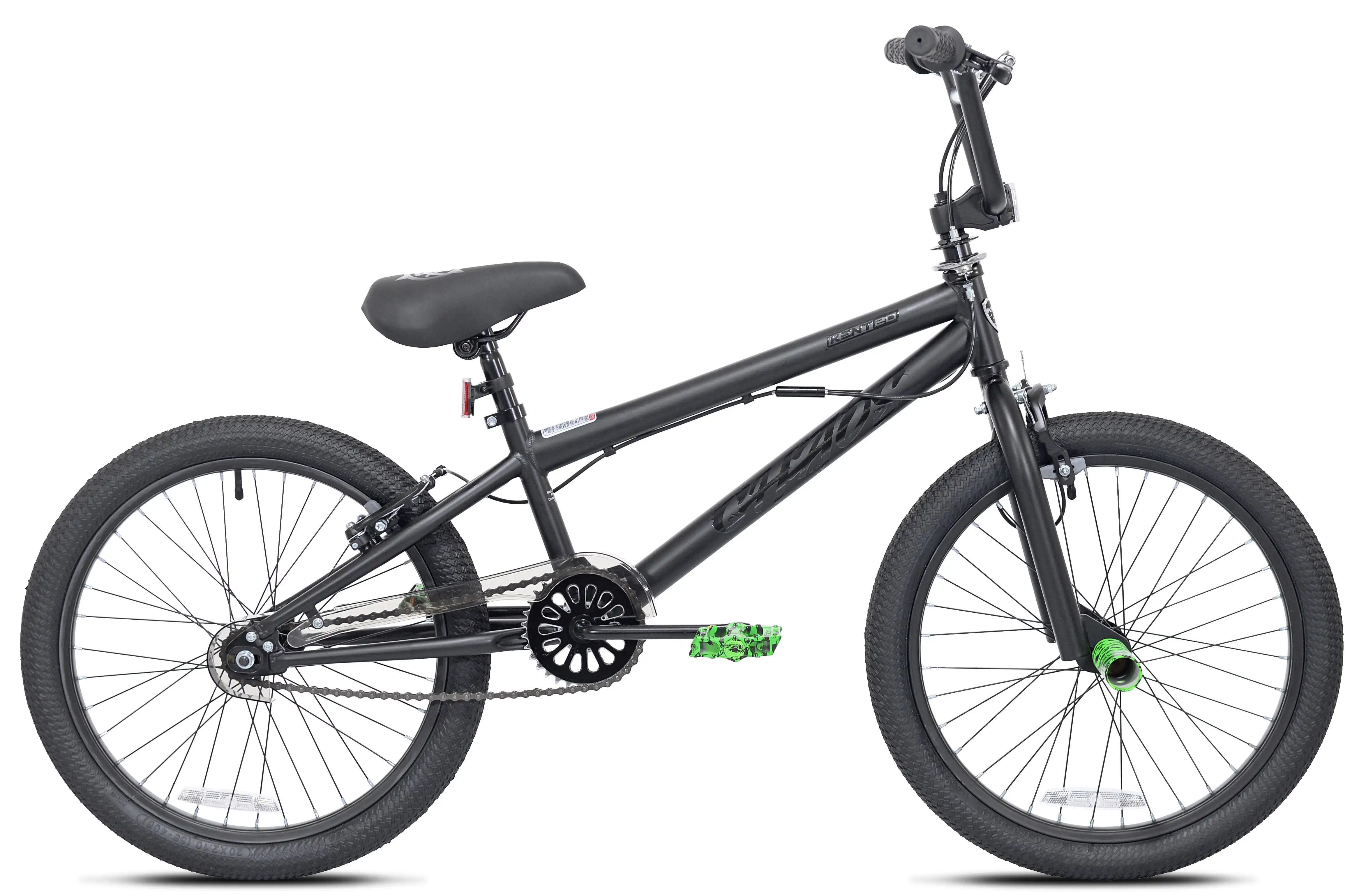 The 20″ chaos boy’s BMX bike comes in a matte black color with cool green and black hydro dipped pedals and pegs. This single-speed 20-inch chaos boy’s freestyle bike is a tricked-out ride that is made for action. It is an ideal bike for improving your freestyle chops and short cruises around the neighborhood. This bike is equipped with a reinforced high-tensile steel frame, 20-inch by 2.1-inch freestyle tires, and front steel pegs. This 20-inch freestyle bike also has sturdy alloy rims, dual-caliper hand brakes in a matching green color, and a smoke color PVC chain cover. It is designed for riders from 8 to 12 years of age.