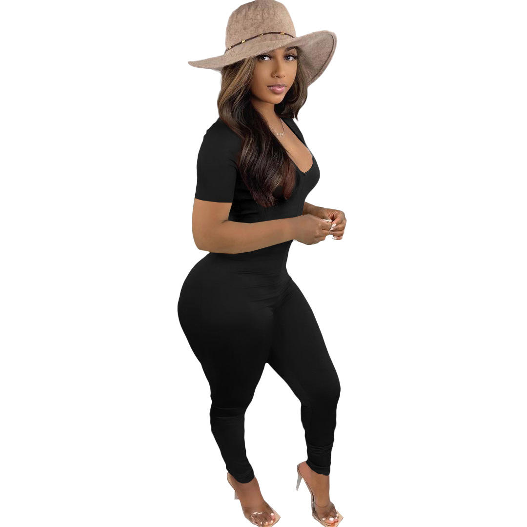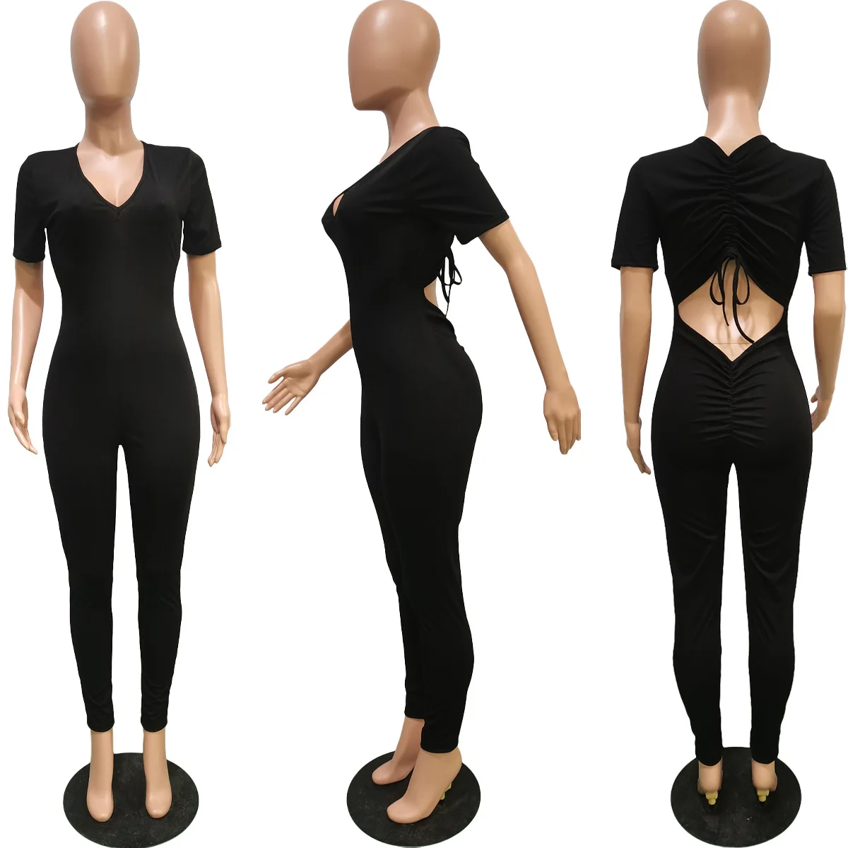 Summer Bodycon Short Sleeve Jumpsuits for Women Telescopic Drawstring One Piece Rompers Wrinkled Back Hollow Out Rompers Pants