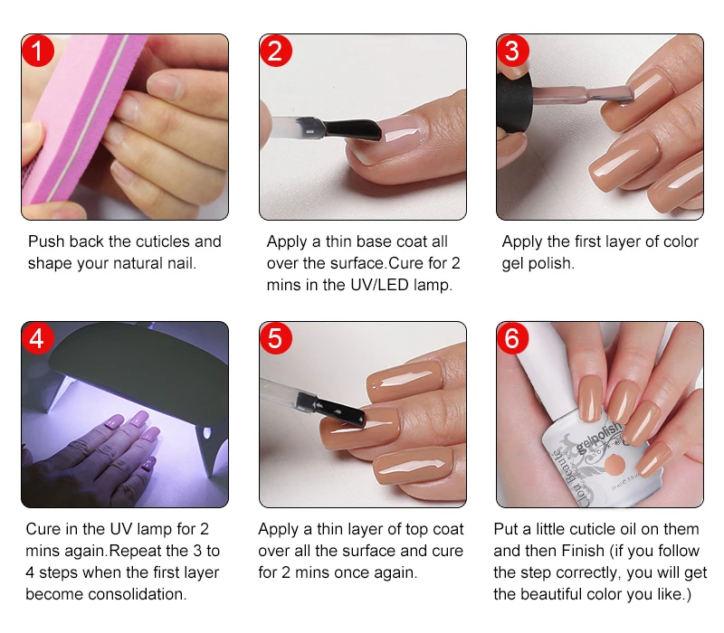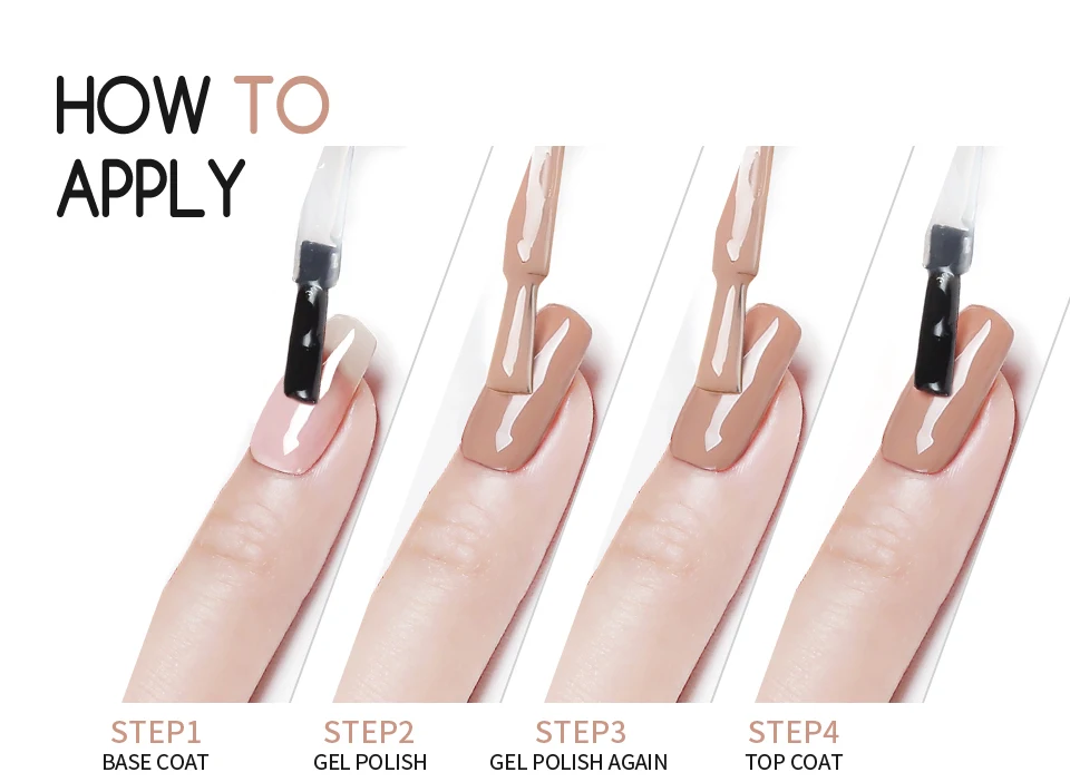 4. Apply first layer of color gel polish directly, cure with UV lamp for 2 minutes or cure with LED lamp for 60 seconds.