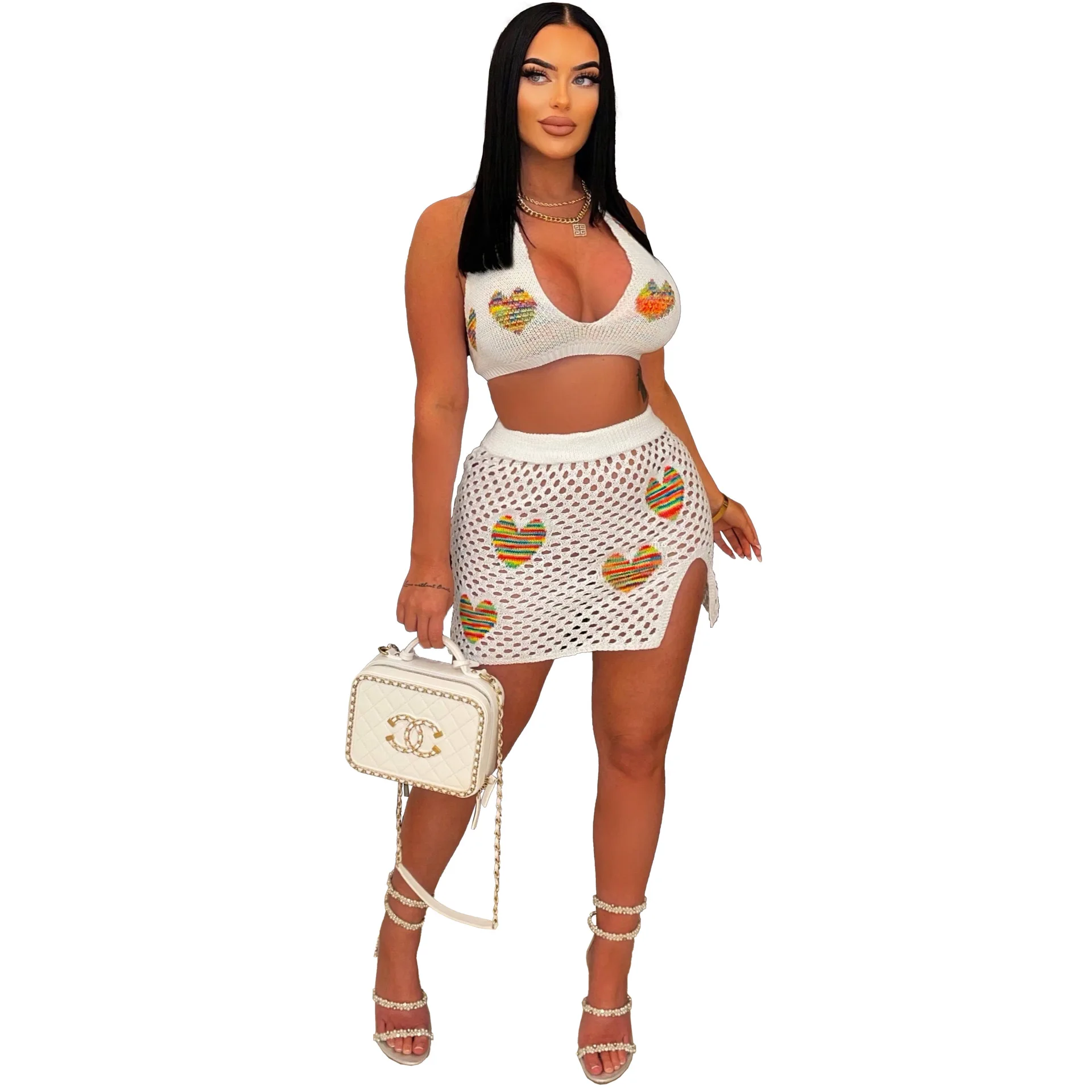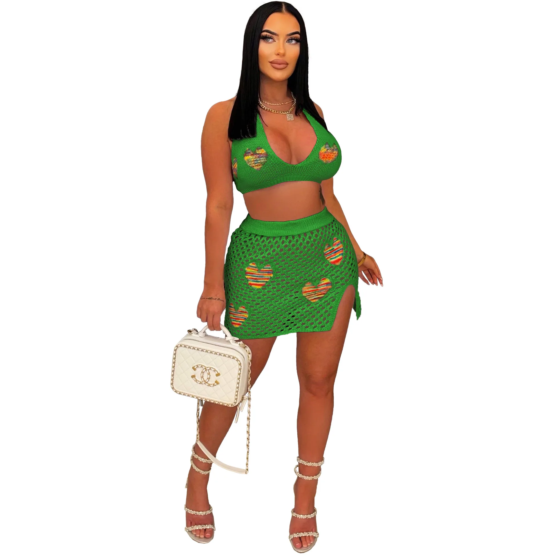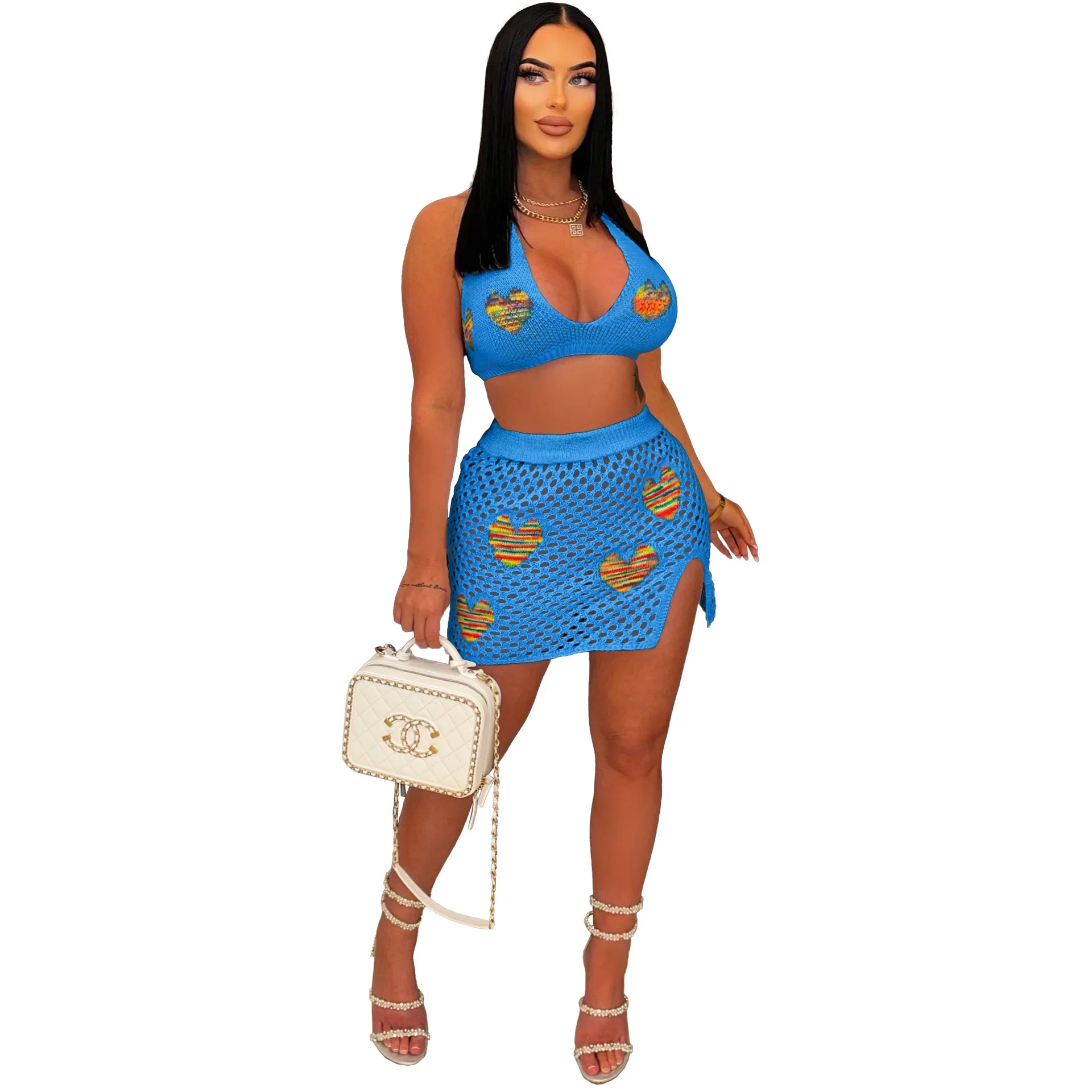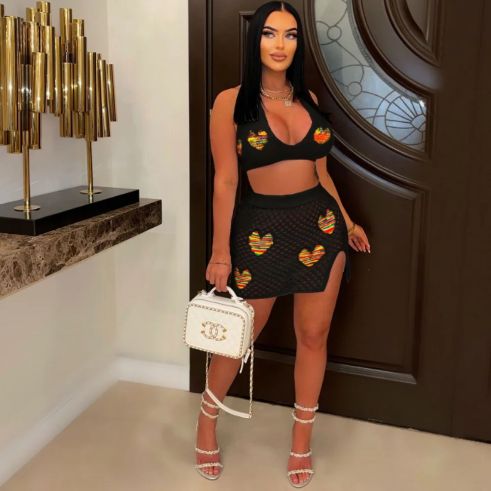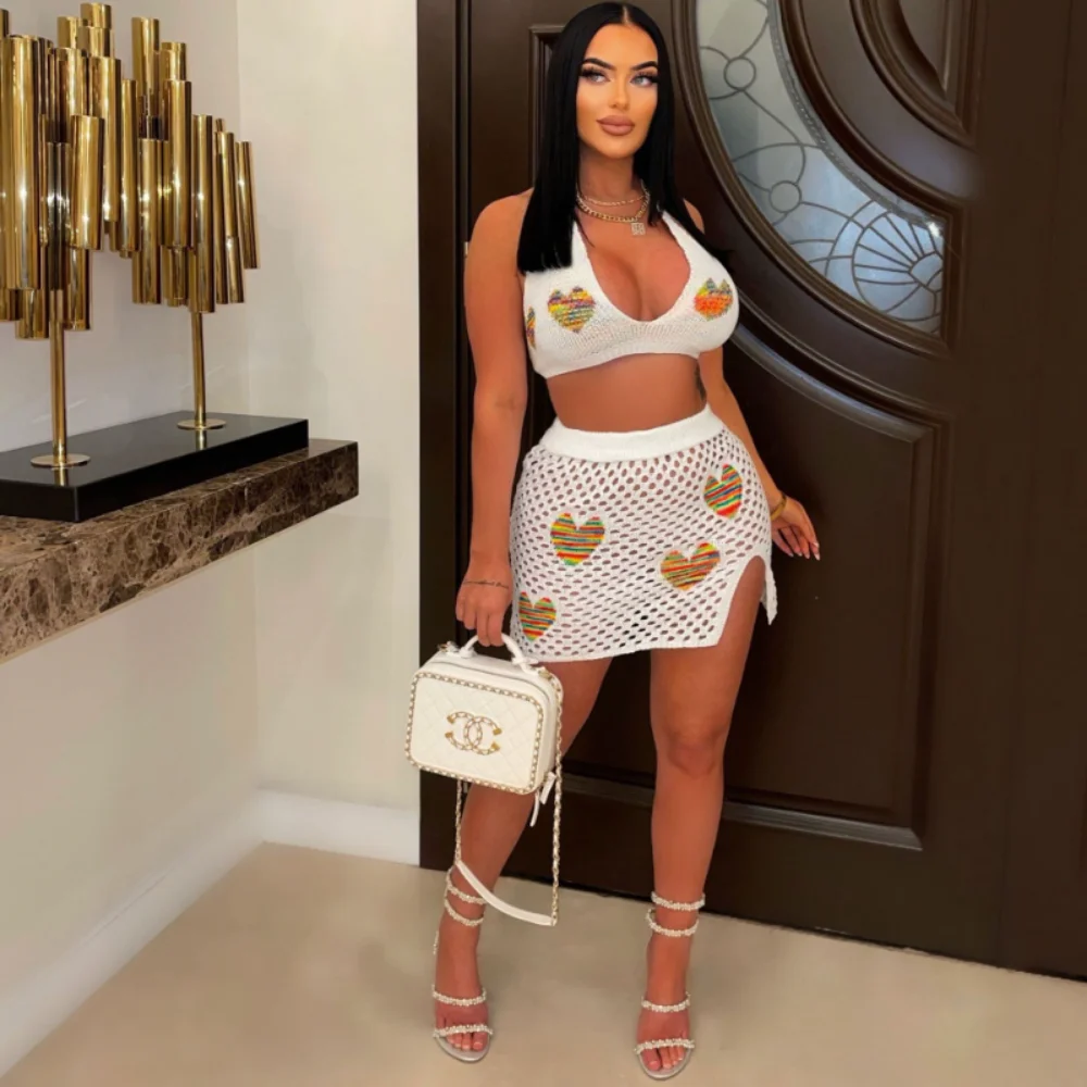 Loveheart Jacquard Knitted Two Piece Set Outfit Party Club Dress Women Lace Up Backless Bra Top Split Skirt Beachwear Suit