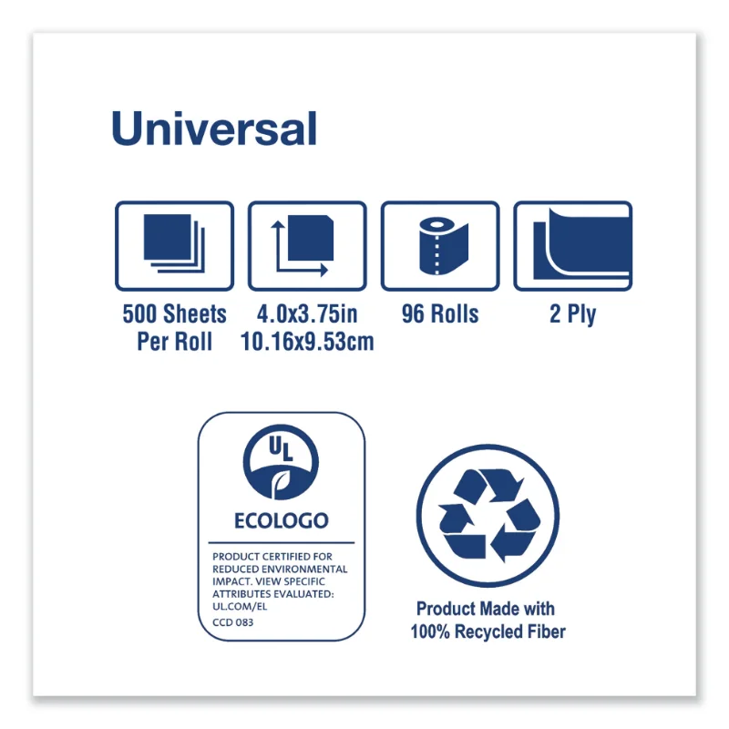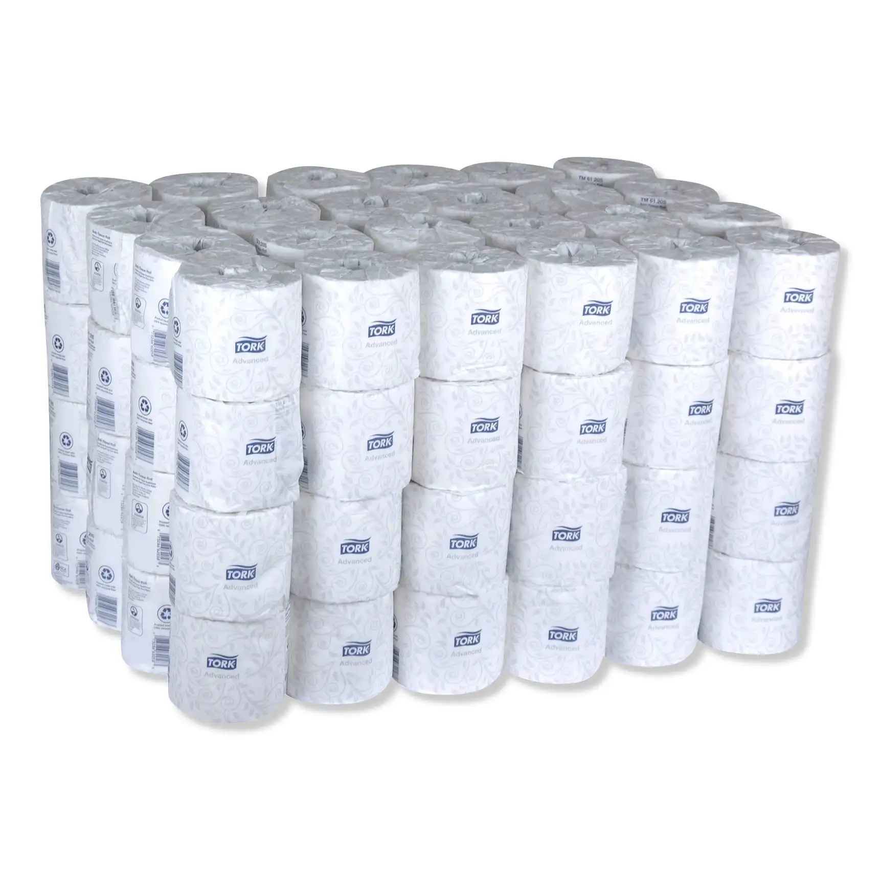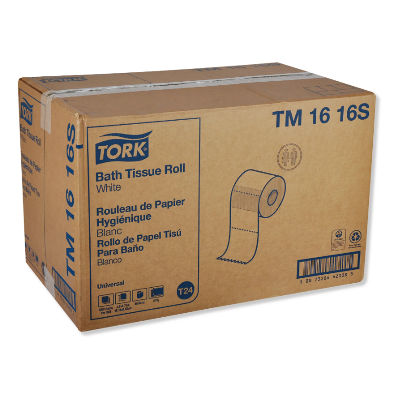 Septic Safe Toilet Paper, 2-Ply, White, 500 Sheets/Roll, 96 Rolls/Carton. Tork Universal Bath Tissue is an absorbent economical toilet paper that delivers value and performance while embossed to enhance bulk and softness. Provides special tightly wound rolls and easy start tail seals to prevent waste and aid in source reduction. Each roll is elegantly wrapped to ensure sanitary protection while delivering quality, value, and performance. Tork toilet paper has rapid breakup, ideal for all plumbing systems. All Tork bath tissue products are safe for septic systems. Individually Wrapped Roll. Tissue Type: Toilet; Number of Plies: 2; Number of Sheets: 500; Length: 3.75″. Compliance Standards: EcoLogo Certified; EPA Compliant. Post-Consumer Recycled Content Percent: 20%. Pre-Consumer Recycled Content Percent: 80%. Recycled Comments: Contains a minimum of 20% post-consumer recycled content, 100% total recycled content.