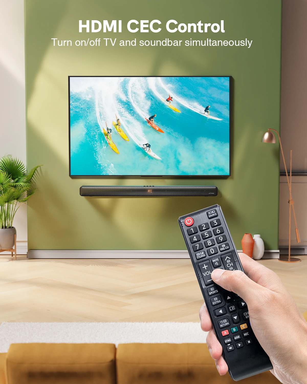 So with the HDMI output, you can use your own remote to turn the TV and soundbar on and off or adjust the volume, making control easy.