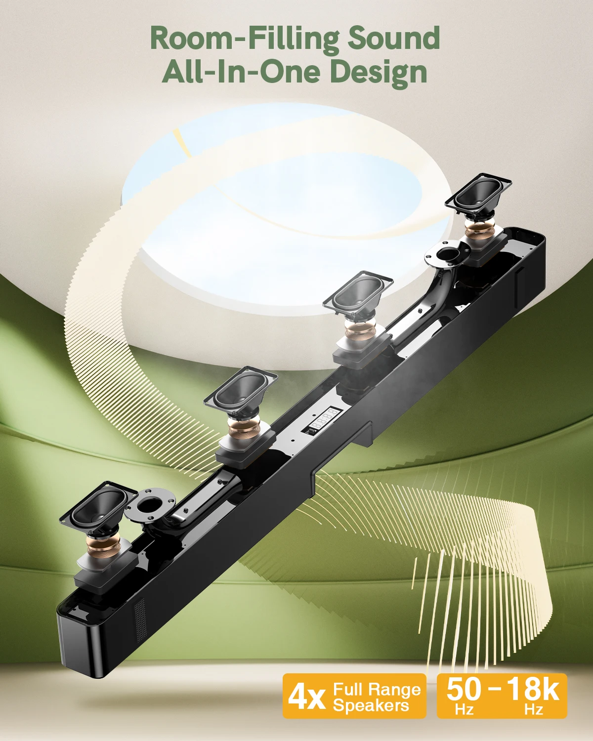 The TV device sound bar features 4 full-range drivers and 2 silk-film tweeters. Brilliant high-frequency sound, clear human voice and pleasant bass. 0.5% ultra-low distortion gives you balanced and clear full band sound.