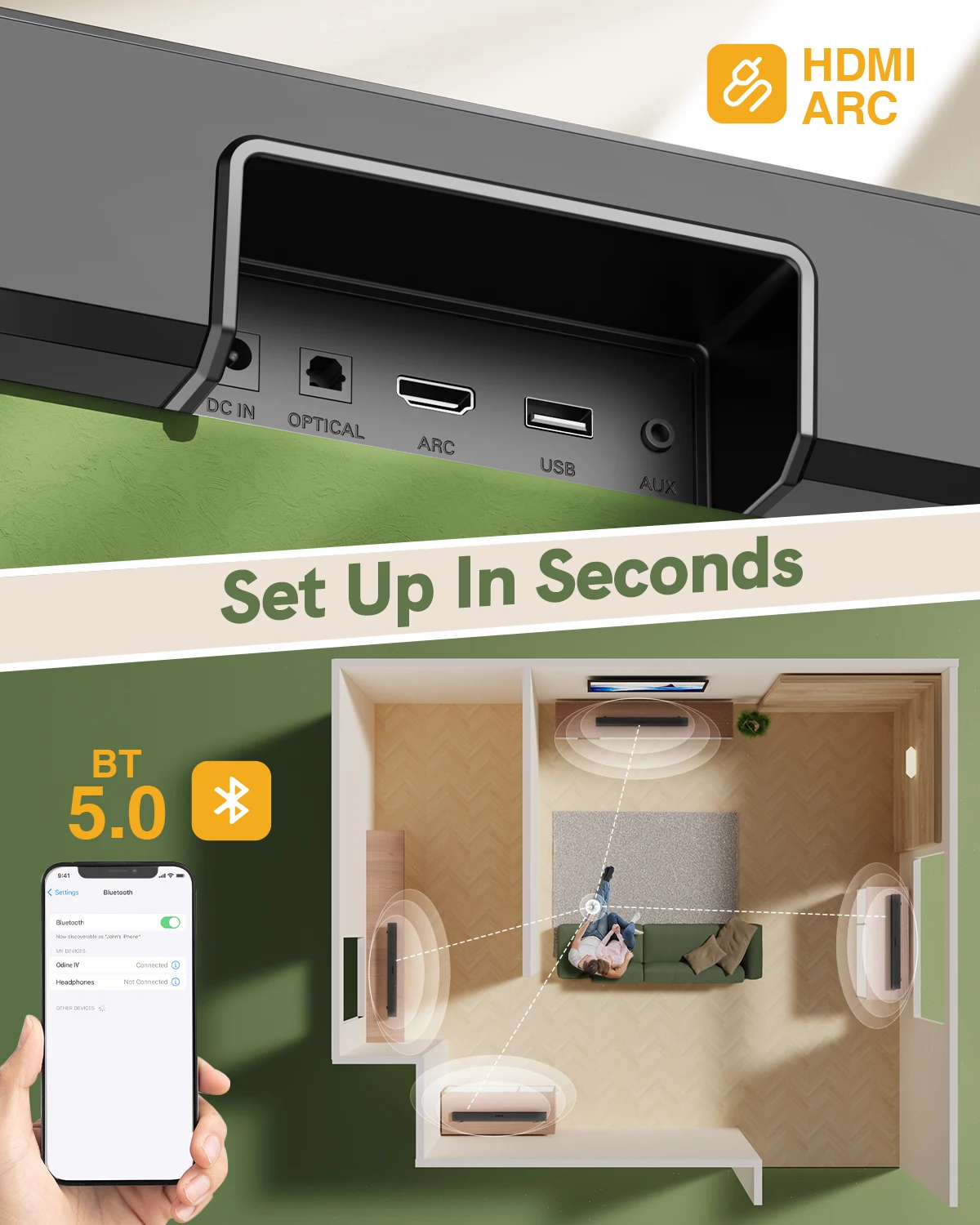 With Bluetooth 5.0, you can easily connect portable mobile devices. Equipped with HDMI (ARC support) / optical / AUX / USB interfaces, you can quickly connect the soundbar to your TV, PC or game console with just one cable. Accessories include RCA, AUX and optical cable.