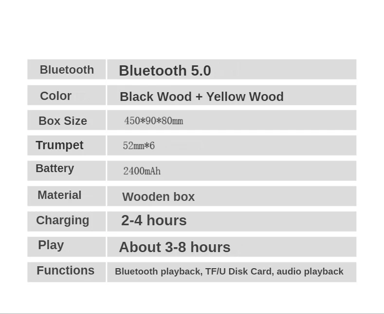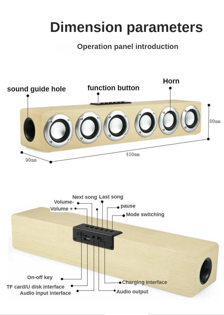 Supported functions: Bluetooth function +TF plug-in card function +U disk function + wired audio input function + wired audio output function